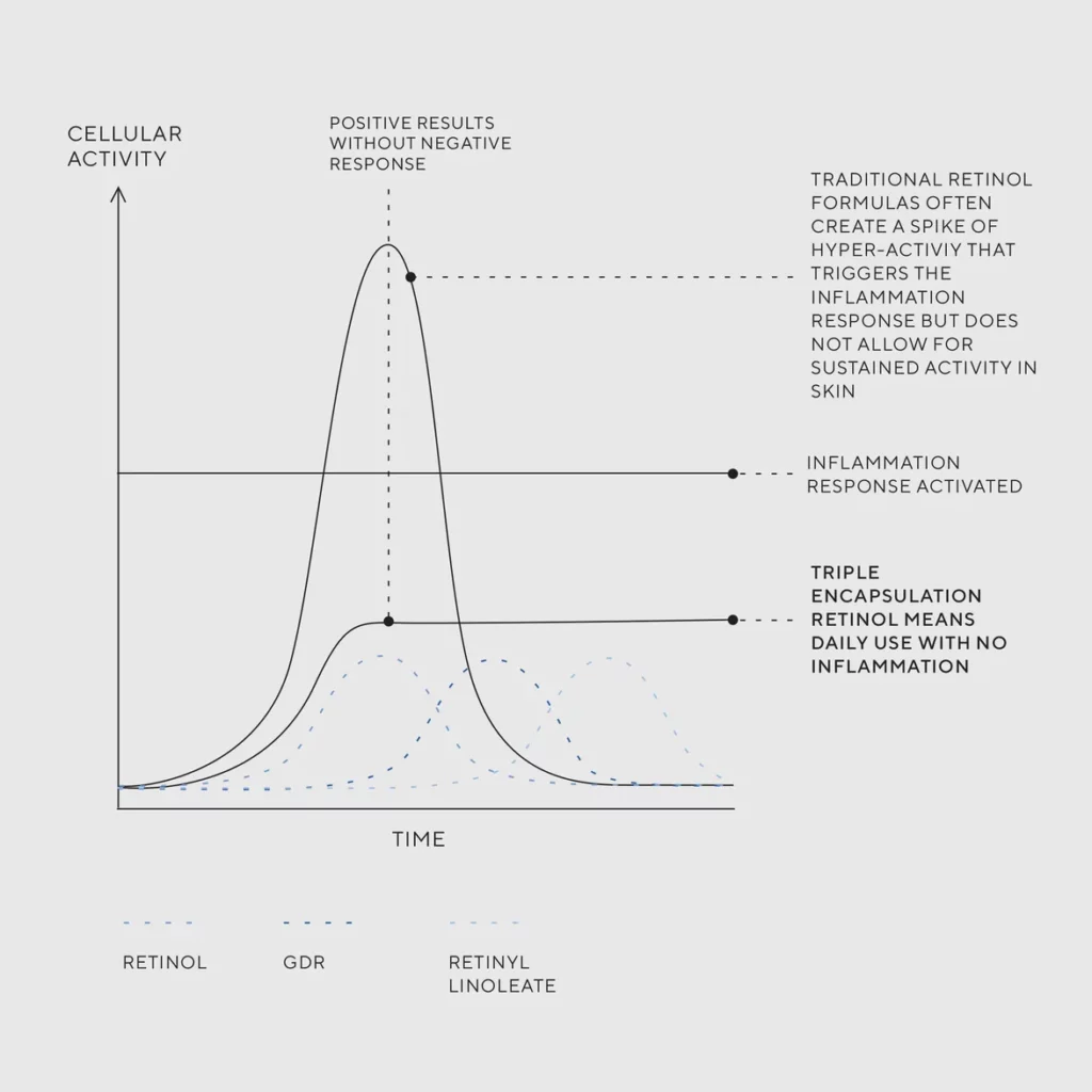• SYSTÈME DE LIBÉRATION DE CONTRÔLE SUPÉRIEUR : Des recherches approfondies ont été menées pour sélectionner des rétinoïdes présentant des taux de conversion synergiques. Cela permet des caractéristiques de « libération lente » tout en maintenant une activité de renouvellement optimale sans inflammation. Activité constante = résultats optimaux sans temps d’arrêt.